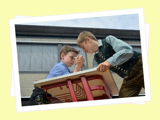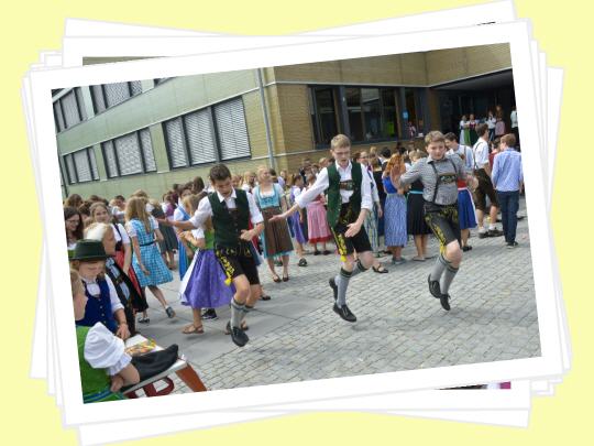 Der letzte Tag vor den Pfingstferien stand auch in diesem Schuljahr ganz unter dem Motto „Brauchtum“. Der Großteil unserer Schülerinnen und Schüler und auch einige Lehrkräfte zogen an diesem Morgen ein ganz besonderes Gewand aus dem Schrank: Dirndl und Lederhos’n. Der Vormittag war gefüllt mit von verschiedenen Klassen organisierten Spielen und Aktionen, wie zum Beispiel Maßkrugstemmen, Schafkopfen, Fingerhakeln, Platteln oder Weißwurstschubsen. Ein großes Highlight war dabei eine Modenschau, in der sowohl Schüler als auch Lehrkräfte ihr Gewand und ihr Talent auf dem Laufsteg präsentierten. Natürlich wurde auch kulinarisch einiges angeboten: Weißwürste und Brez’n, von Schülern selbstgemachte Lebkuchenherzen oder sehr leckere, von den Flintsbacher Nudelbäckerinnen frisch zubereitete Auszog’ne. Für die musikalische Umrahmung des sehr gelungenen Vormittags sorgte unser Blasorchester. Mit einem gemeinsamen Foto aller Trachtler endete der Schultag und die Schülerinnen und Schüler wurden in die wohlverdienten Ferien entlassen. . |